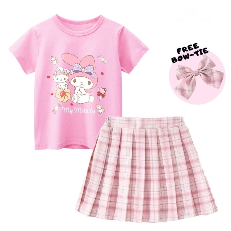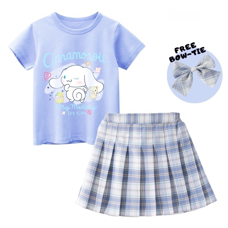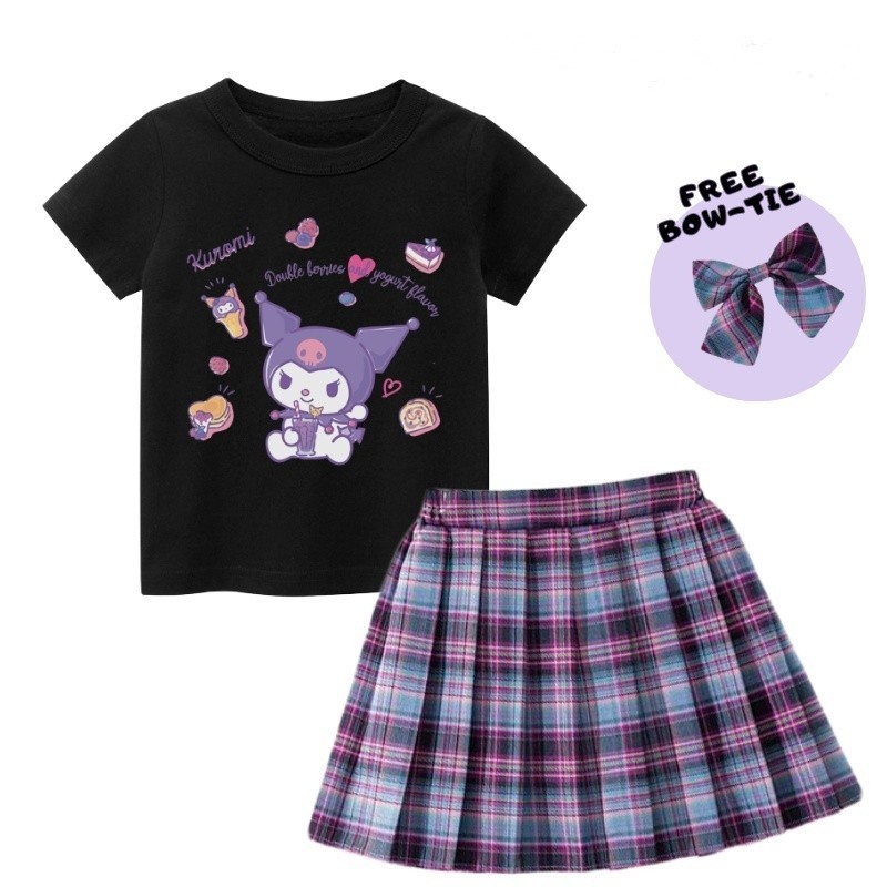 Girls Suit Cartoon Kurumi 100% Cotton T-Shirt and JK Dress Checked Skirt Free Bow Tie